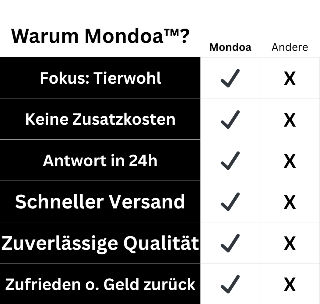 Manchmal ist es das Zubehör, manchmal die kleinen Details - aber immer geht es um das Gleiche: Du willst das Beste für dein Tier. Genau deshalb entwickeln wir bei Mondoa Produkte, die dir wirklich helfen - liebevoll gedacht, praktisch gemacht.